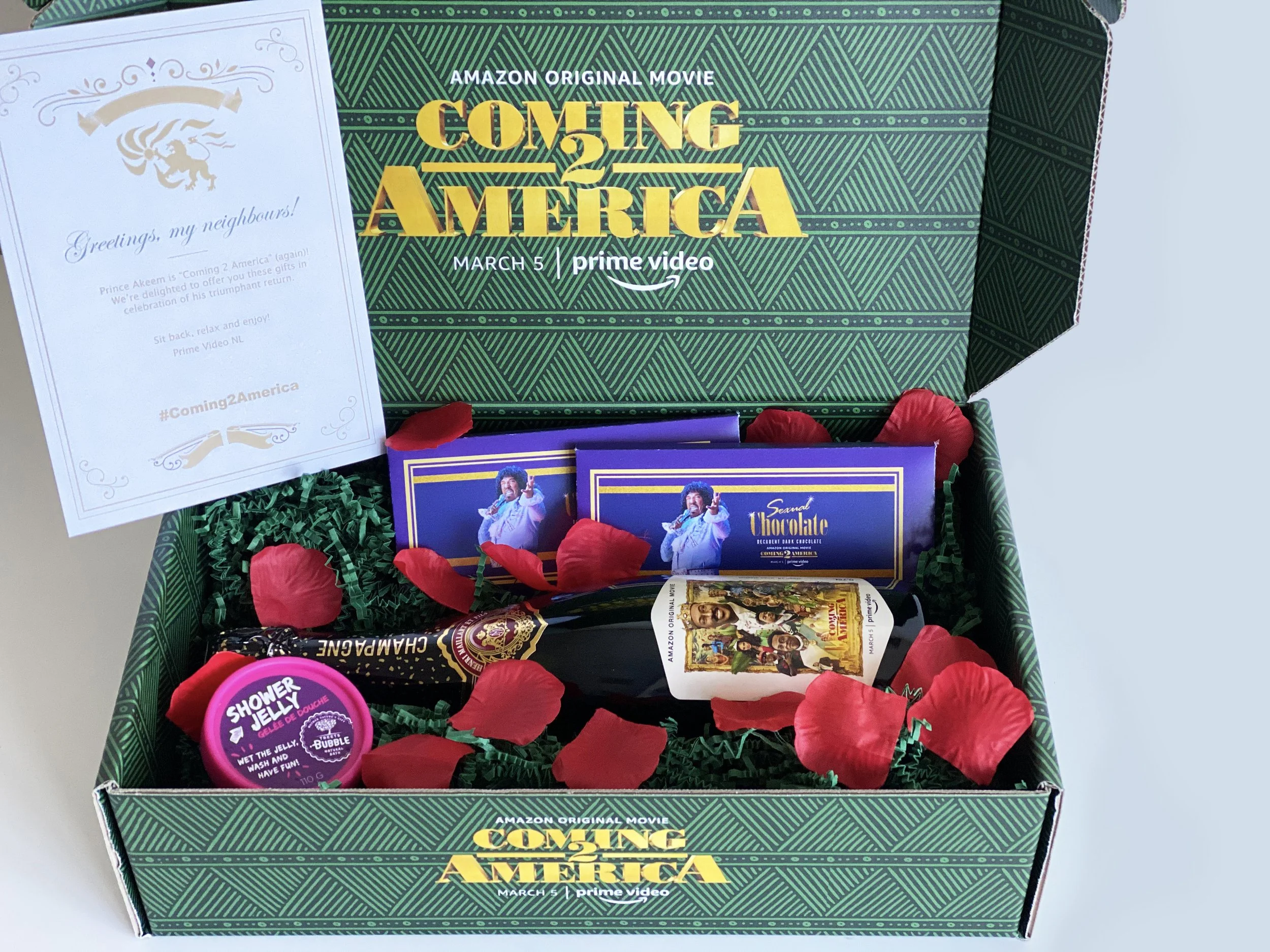 Verder bevatte de box een reep chocolade met daarop een afbeelding van Randy Watson (één van de filmpersonages), een potje badschuim (refererend naar een bad scène uit de film) en een persoonlijke uitnodiging om de film op de release-datum te bekijken op Amazon Prime, zogenaamd geschreven door de hoofdpersoon uit de film.